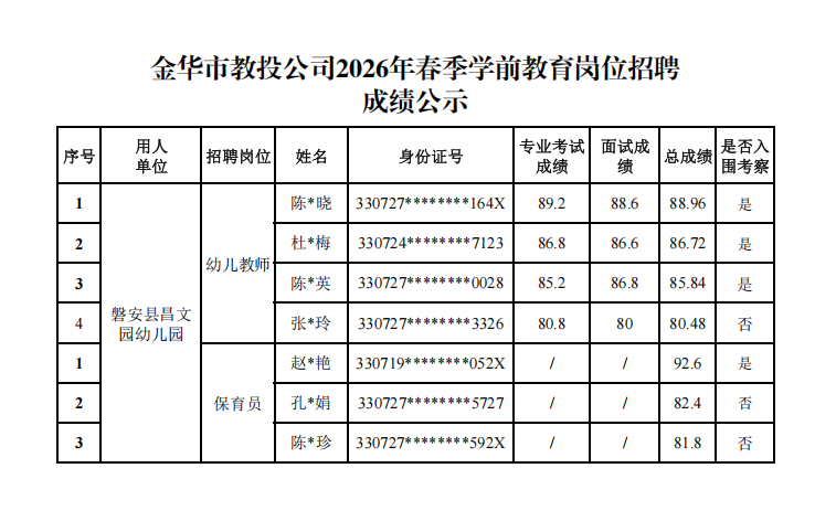 金华bbin宝盈教育2026年春季学前教育岗位招聘成绩公示
