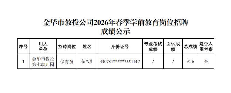 金华bbin宝盈教育2026年春季学前教育岗位招聘成绩公示